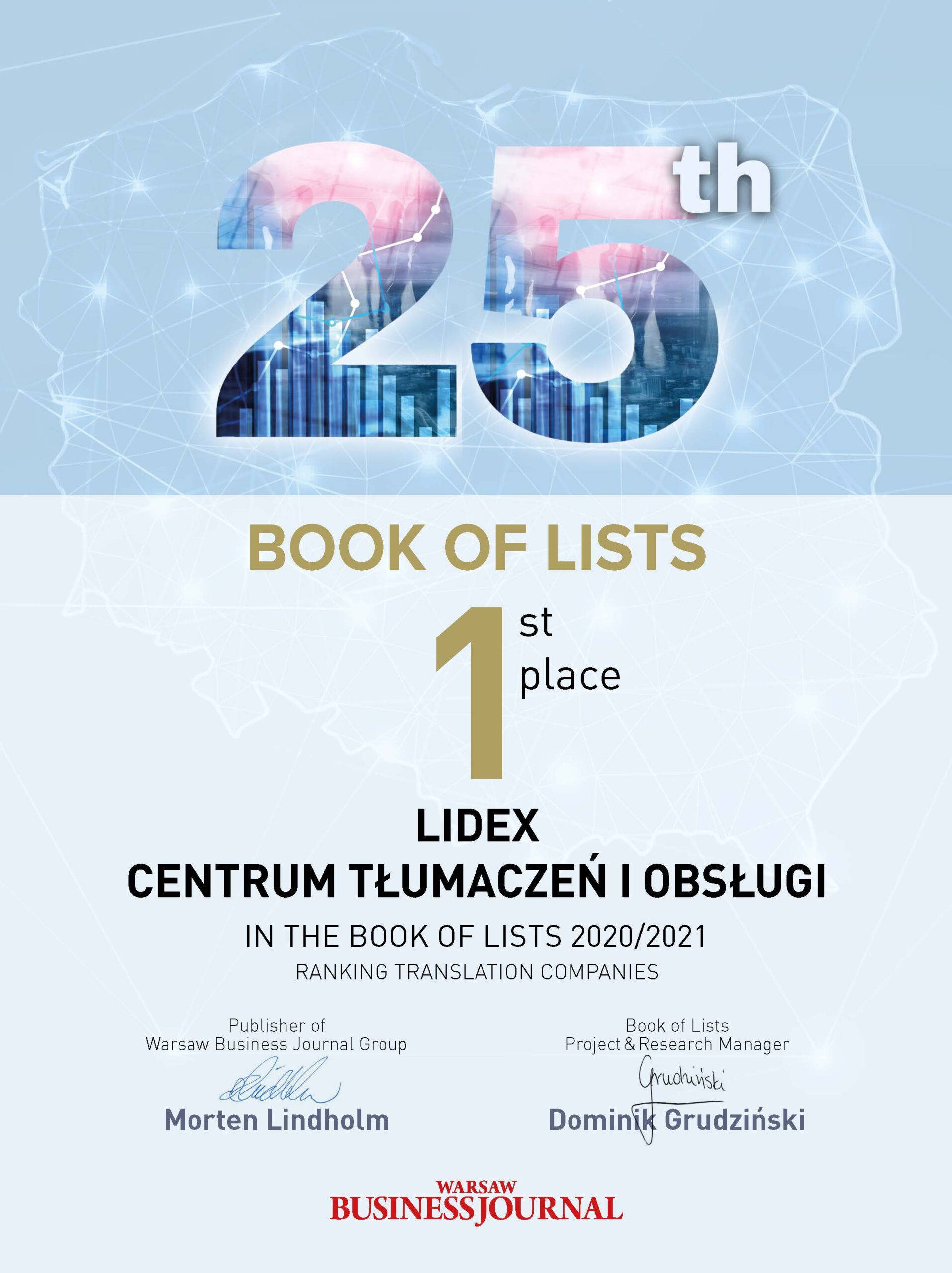 Zakończyliśmy 2020 rok znakomitą wiadomością: Lidex znów zajął pierwsze miejsce w rankingu Warsaw Business Journal. Tym samym po raz kolejny potwierdziliśmy pozycję lidera w branży tłumaczeniowej w Polsce!